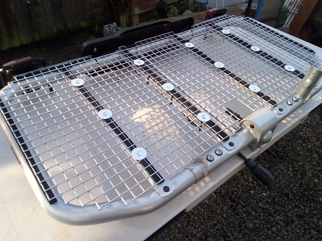 Then some Neoprene Foam strips put on the base to provide some anti-vibration & anti-rattle support for the mesh; Then bolted it down using Roofing Bolts with Penny Washers at the top and standard washers and Nylock nuts underneath.