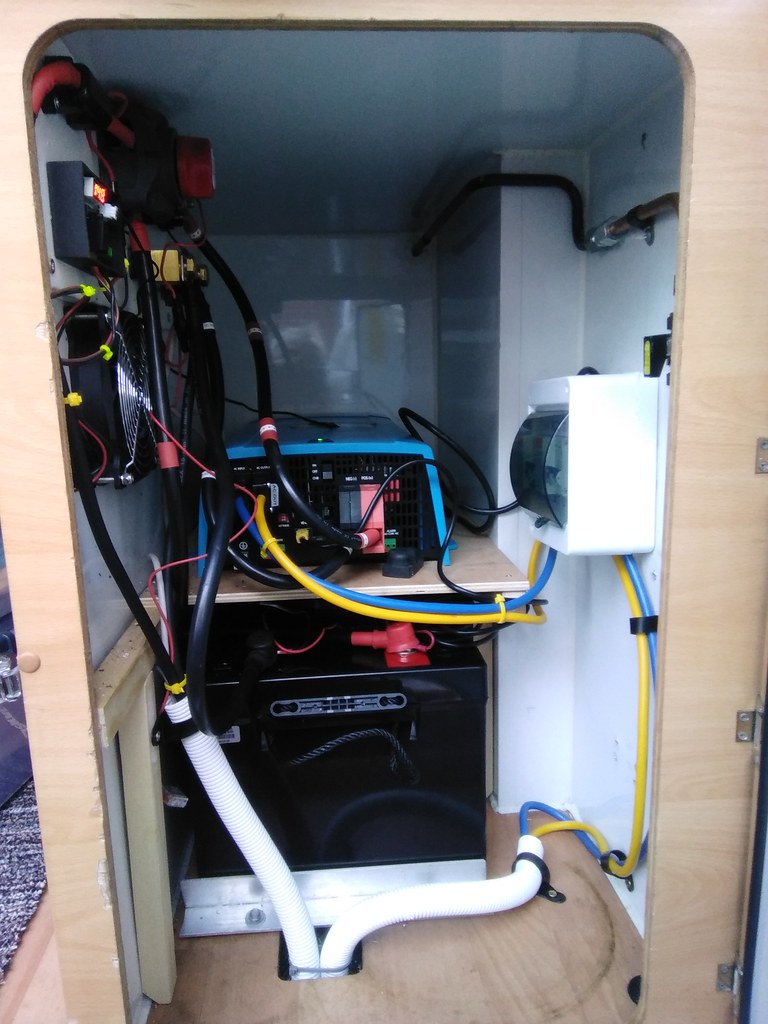 On the Right wall 240V Consumer unit with RCBO into Multiplus, RCBO out of Multiplus, plus an MCB for a flying IEC lead for Charger use.
