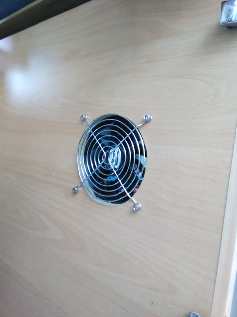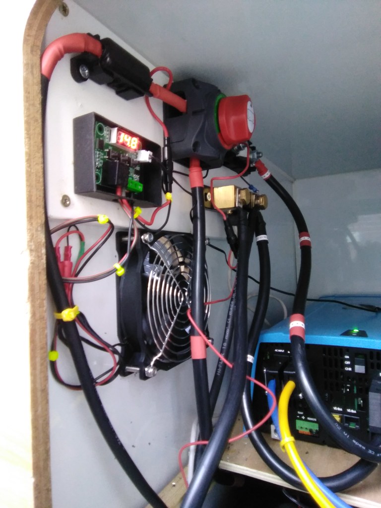 On the Left wall, Isolation Switch for the Battery, 80A Fuse for the Hab 12V Supply, 175A Fuse for the MP 12V Supply, Shunt for the BMV-712, and a Temperature Controller that monitors the Muliplus case temp and activates a fan to draw the warm air out the locker when over the set temp (cool air is brought in from underneath via the drop-out vent.
