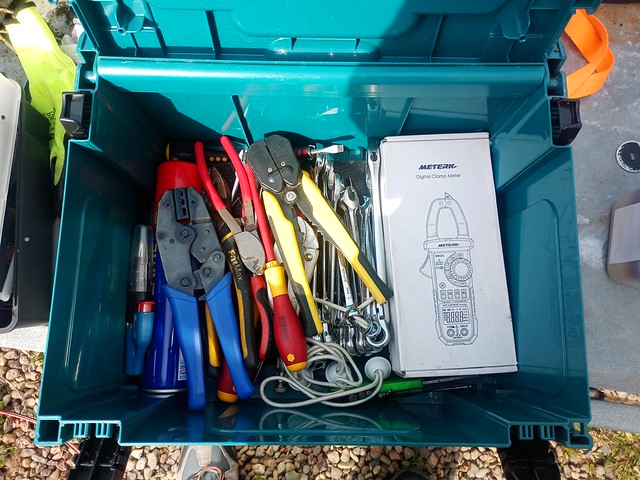 Bottom of the box is the 'big tools' - selection of spanners, pliers, crimpers, cutters, etc, plus a Clamp DigitalMultiMeter.